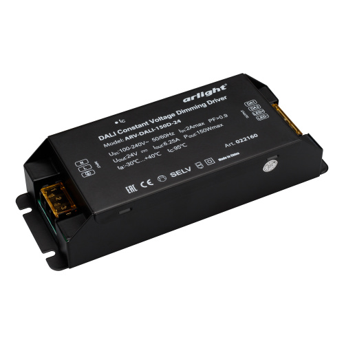 Блок питания ARV-DALI-150D-24 (24V, 6,25A, 150W, DALI, PFC) Диммируемый блок питания 24V 6,25A 150W, металл IP20, для светодиодных изделий. Позволяет управлять яркостью светодиодных лент от контроллера/панели DALI. Габариты 196х75х40 mm. Вход 100-240
