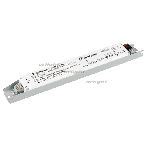 Блок питания ARV-SP-24060-LINEAR-PFC-DALI2-PD (24V, 2.5A, 60W) (Arlight, IP20 Металл, 5 лет) Диммируемый источник напряжения по протоколу DALI 2.0 и функцией PUSH DIM с гальванической развязкой для светодиодных изделий. Входное напряжение 220-240 VAC. Выходные параметры: 24 В, 2,5 А, 60 Вт. Встроенный PFC >0,95. Негерметичный алюминиевый корпус IP 20.Габаритные размеры длина 250 мм, ширина