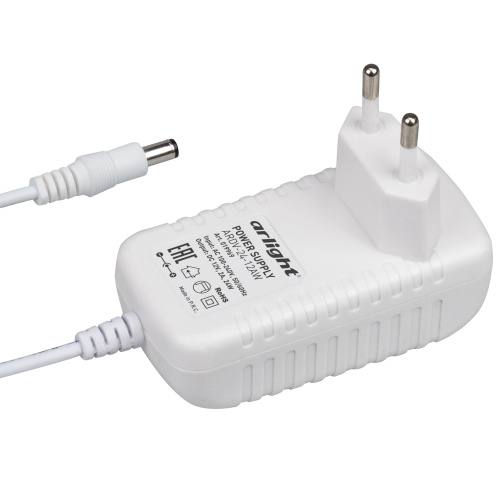 Блок питания ARDV-24-12AW (12V, 2A, 24W) Сетевой адаптер для светодиодных лент 12 В (белый корпус). Мощность 24 Вт. Вход:100-240VAC, Выход: DC12V 2A, длина кабеля 1,5 м, коннектор 5.5x2.1x10мм. Размер 83x43x30 мм (размер без вилки). Гарантия 2 года.