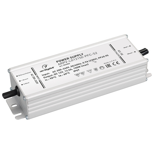 Блок питания ARPV-SPE12150 (12V, 12.5A, 150W, PFC) Блок питания 12V,ток 12,5А, 150Вт, герметичный, для светодиодных изделий. Алюминиевый корпус IP67. Габариты 190x61x36 mm. Вход. напряж-е 200-240V AC, выход 12V DC +-5%, коэффициент мощности PF>0,95.