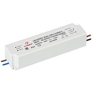 Блок питания ARPV-LM36060 (36V, 1.67A, 60W) Блок питания 36V, ток 1,67А, 60Вт. Герметичный пластиковый корпус IP67, для светодиодных изделий. Вход 100-240V AC, выход 36V DC +-5%. Размеры 162х42х34mm.