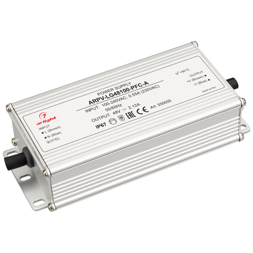 Блок питания ARPV-LG48100-PFC-A (48V, 2.12A, 100W) (Arlight, IP67 Металл, 5 лет) Блок питания для светодиодных лент с гальванической развязкой, корпус металл IP67, мощность 100 Вт; Входное напряжение 100-240V; Выход 48V 2.12A, PF>0,98; Совместимость со стандартом EMC. Размер 150x67,5x35,5 мм. Гарантия 5 лет.