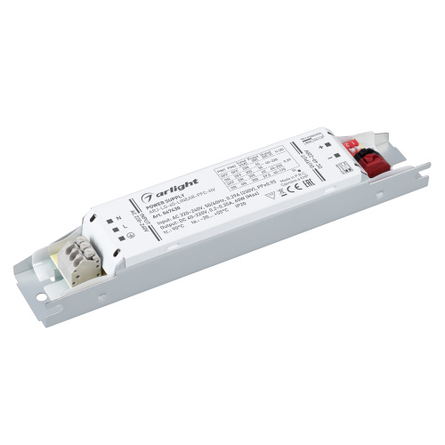 Блок питания ARJ-LG-60-LINEAR-PFC-HV (60W, 40-220V, 0.2-0.35A) (Arlight, IP20 Металл, 5 лет) Регулируемый источник тока без гальванической развязки для светильников и мощных светодиодов. Входное напряжение 220-240 VAC. Выходные параметры: 200мА - 40-220В, 250мА - 40-220В, 300мА - 40-200В, 350мА - 40-170В, максимальная мощность 60 Вт. Встроенный PFC >0,95. Негерметичный металлический корпус IP 20. Габаритные размеры длина 165 мм, ширина 30 мм, высота 21 мм. Гарантийный срок 5 лет.Источник тока серии ARJ-HV без гальванической развязки предназначен для питания одновременно группы светильн