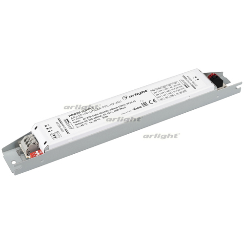 Блок питания ARJ-SP-40-LINEAR-PFC-HV-ADJ (40W, 250-400mA) (ARL, IP20 Металл, 5 лет) Источник тока регулируемый 250-300-350-400mA (дип-переключатель), с гальванической развязкой, вых. напр. 80-160V(250mA), 65-133V(300mA), 65-114V(350mA), 65-100V(400mA), макс. 40 Вт. Металлический корпус IP20, размеры 230x30x21 мм. Питание 220-240VAC, корректор мощности PFC>0,95. Диапазон раб.темп. -