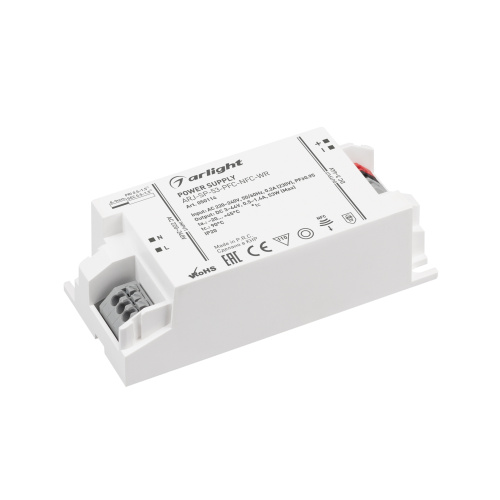 Блок питания ARJ-SP-53-PFC-NFC-WR (53W, 3-44V, 0.5-1.4A) (Arlight, IP20 Пластик, 5 лет) Мультитоковый блок питания с гальванической развязкой. Входное напряжение 220-240 VAC. Выходные параметры: 3-44В (500-1200мA), 3-42В (1250мА), 3-40В (1300мА), 3-39В (1350мА), 3-38.5В (1400мА); 53Вт, PF >0,95. Негерметичный пластиковый корпус IP 20.Выбор значения выходного тока осуществляется с помощ