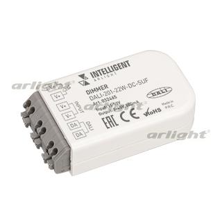 INTELLIGENT ARLIGHT Диммер DALI-201-22W-DC-SUF (8-45V DC, 500mА) Диммер DALI для светильников. Вход 11-50V DC, выход 500mA 8-45V DC (в зависимости от вых. тока), мощн-ть 22W. Размеры 60x35x16 мм.