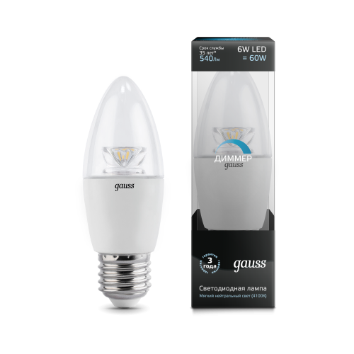 Лампа Gauss LED Candle-dim Crystal Clear E27 6W 4100К диммируемая 1/10/50