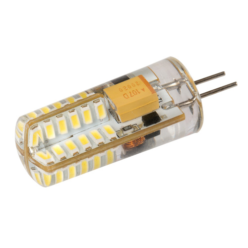 Светодиодная лампа AR-G4-1338DS-2W-12V Day White Лампа G4 в силиконе. Цвет ДНЕВНОЙ БЕЛЫЙ 4000-4500К, мощность 2.0 W, питание DC 12V (от стабилизированного источника). Светодиоды 48шт smd 3014. Св.поток 150-160 лм, угол 270 градусов, CRI>80. размеры Д