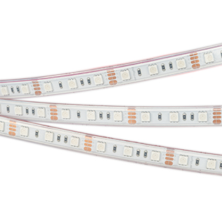 Лента RTW 2-5000P 12V RGB 2X (5060, 300 LED, LUX) Герметичная мультицветная IP66 (плата в силикон.трубке) гибкая лента LUX, светодиоды 2X smd 5060, 60шт/м (300шт на 5м), белая плата 10мм, скотч 3М. Цвет RGB. Питание 12В, мощность 14,4 Вт/м (72 Вт на