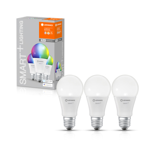 Лампа светодиодная диммируемая OSRAM SMART+ A, 1055лм, 9,5 Вт, (замена 75Вт), RGBW К(мультицвет). Цоколь E27, колба A, угол пучка 215°. Исполнение колбы матовое,пластик. Напряжение питания 285 В. Особенности:WiFi; 3 шт в упаковке. Товар сертифицирован