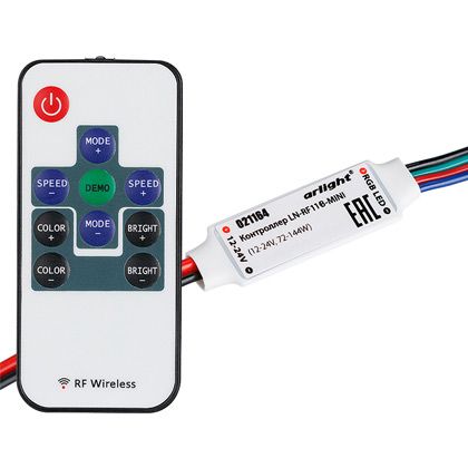 Контроллер LN-RF11B-MINI-RGB (12-24V, 3x2A, ПДУ Карта 11 кн) Малогабаритный RGB-контроллер в термоусад. оболочке с тонким RF (радио) пультом 10 кнопок. Питание 12-24VDC, макс. ток 3x2А, мощность 12V<72W, 24V<144W. Вход - 2 провода, выход - 4 провода