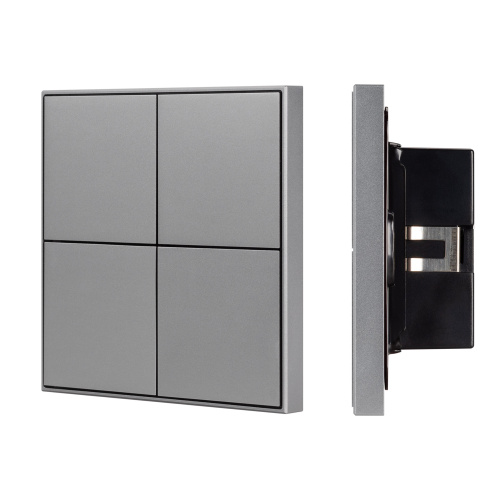 INTELLIGENT ARLIGHT Кнопочная панель KNX-304-23-IN Grey (BUS, Frame) (IARL, IP20 Металл, 2 года) Универсальная многофункциональная встраиваемая настенная панель для систем KNX. 4 рокерные клавиши, 1 клавиша может выполнять функции 2-х клавиш. Тонкая рамка, материал - алюминий, отклик вибрацией, светодиодная индикация. Цвет корпуса - серый. Питание от шины KNX DC 21-30V. Габариты 86x86x33 мм.