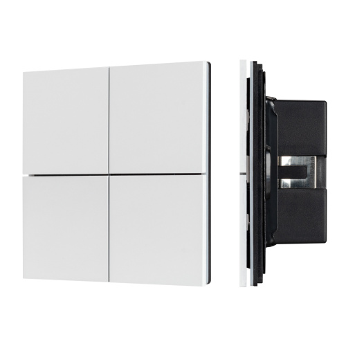 INTELLIGENT ARLIGHT Кнопочная панель KNX-304-23-IN White (BUS, Frameless) (IARL, IP20 Металл, 2 года) Универсальная многофункциональная встраиваемая настенная панель для систем KNX. 4 рокерные клавиши, 1 клавиша может выполнять функции 2-х клавиш. Безрамочный корпус, материал - алюминий, отклик вибрацией, светодиодная индикация. Цвет корпуса - белый. Питание от шины KNX DC 21-30V. Габариты 86x86x33