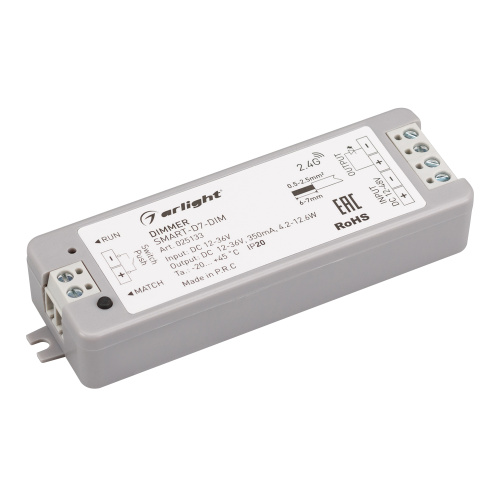 Диммер SMART-D7-DIM (12-36V, 1x350mA) Диммер тока для светильников. Питание/рабочее напряжение 12-36VDC, максимальный ток 350mA на канал, 1 канал, максимальная мощность 4.2-12.6W. Винтовые клеммы. Корпус - PVC. Габариты 97x33x18 мм. Управляется пульт