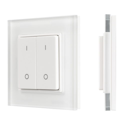 Панель SMART-P47-DIM-G-SUF (3V, 2 зоны, Knob, 2.4G) (ARL, Пластик) Накладная кнопочная панель 2.4 ГГц, цвет белый. Материал - стекло. Для управления одноцветными источниками света, 2 зоны управления. Питание/рабочее напряжение 3VDC от батарейки CR2032. Габариты 86х86х15 мм. Совместима с диммерами SMART.