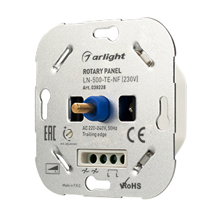 Панель роторная LN-500-TE-NF (230V) (Arlight, IP20 Металл, 3 года) Встраиваемая роторная панель. Для управления одноцветными источниками света (TRIAC). Управление яркостью с помощью роторного вращателя. Работает в режиме Trailing Edge, диммирование по заднему фронту. Не требует подключения N провода. Возможна работа с любым источником света, поддерживающим фазное д