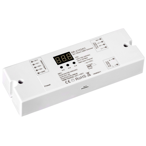 Декодер DMX SR-2102AC (220V, 560W) DMX-диммер для галогенных и других ламп на 220В, а также для высоковольтного неона. Коммутируемая мощность макс. 560Вт (2 канала по 1,2А). Адрес DMX задается кнопками на корпусе, индикация адреса. Размер 168x58х28мм